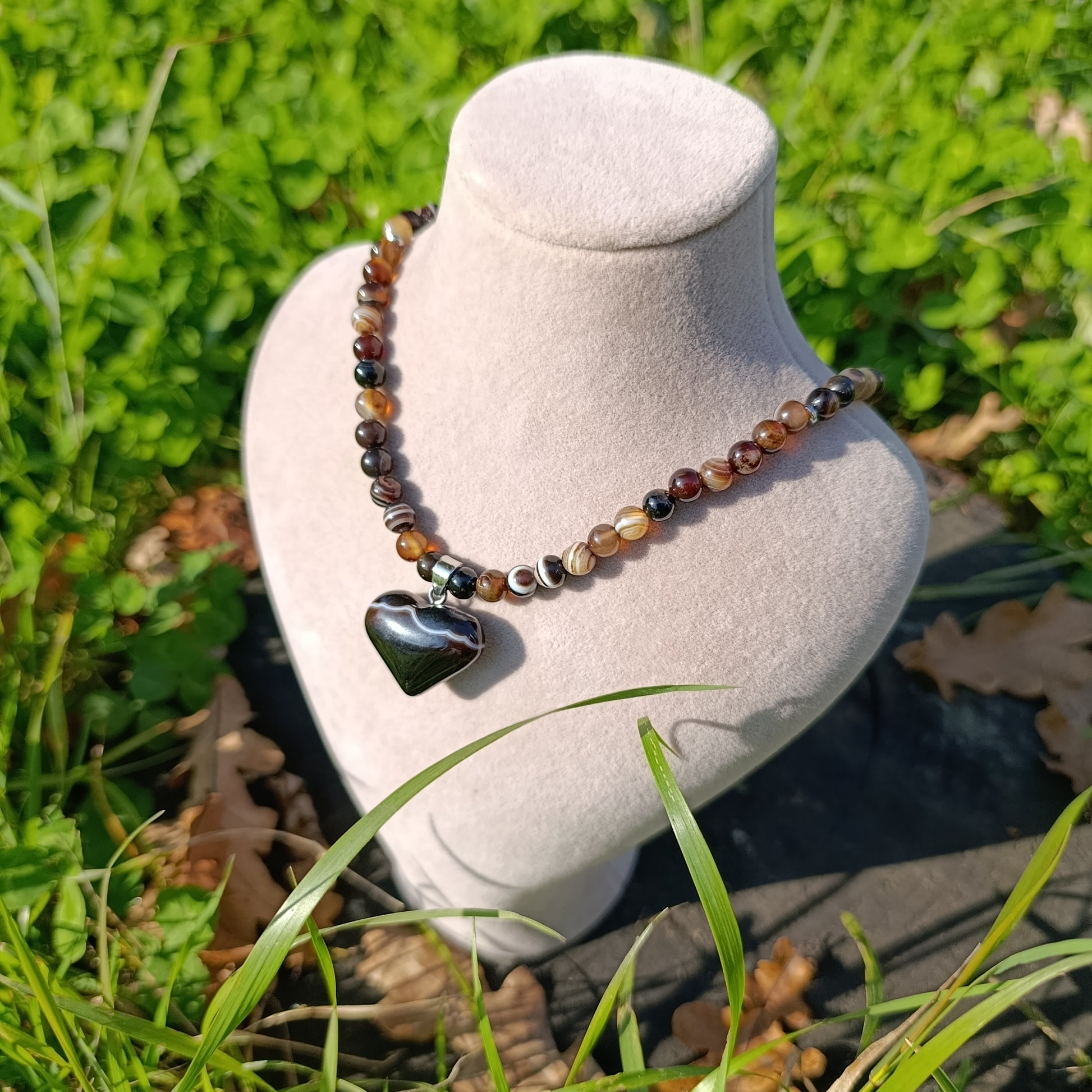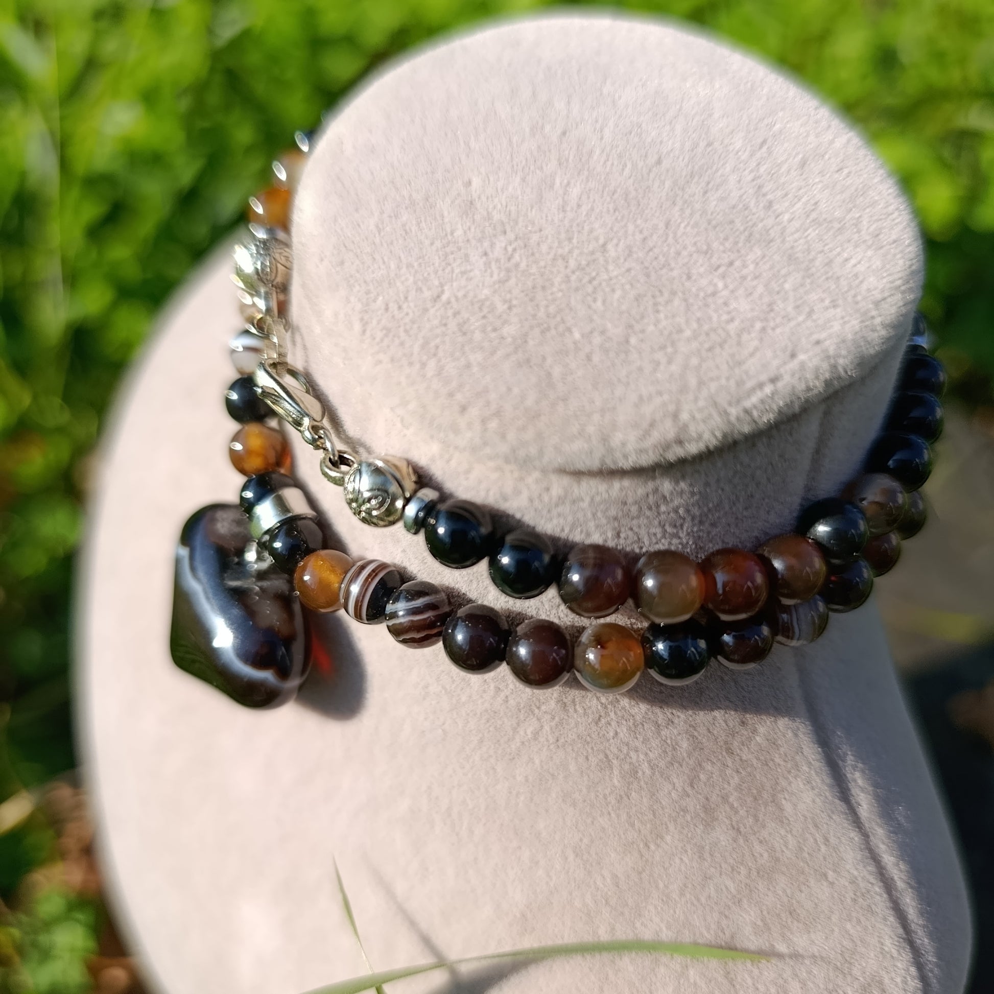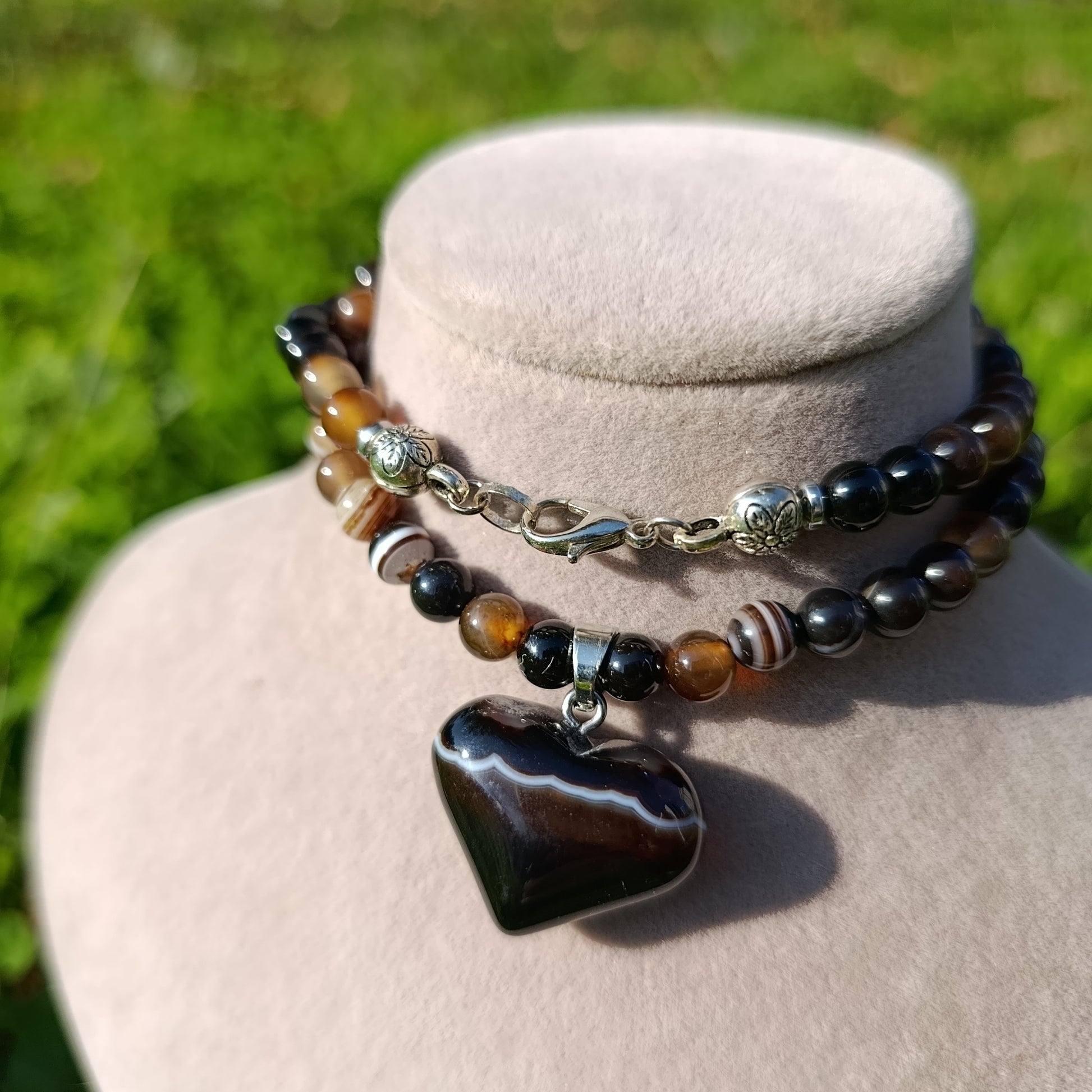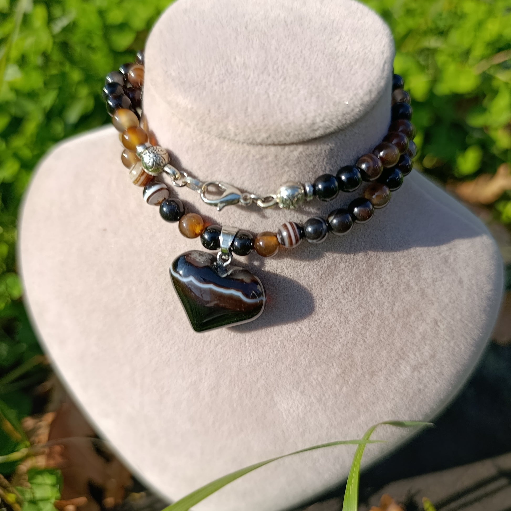 6 mm siyah akik taşları ve ucunda kalp formlu Akıl taşı ile hazırlanmıştır. Metalleri gümüş değildir.