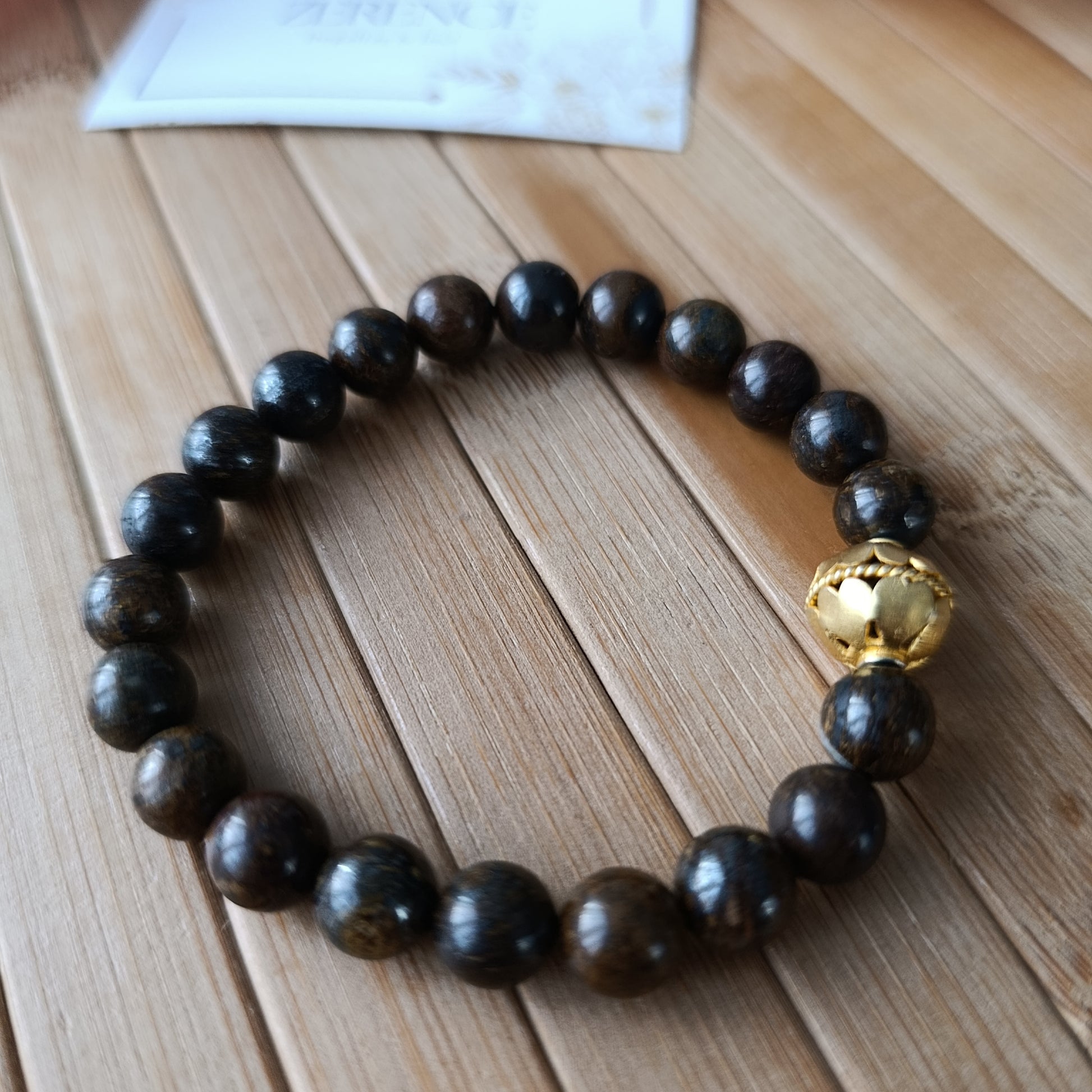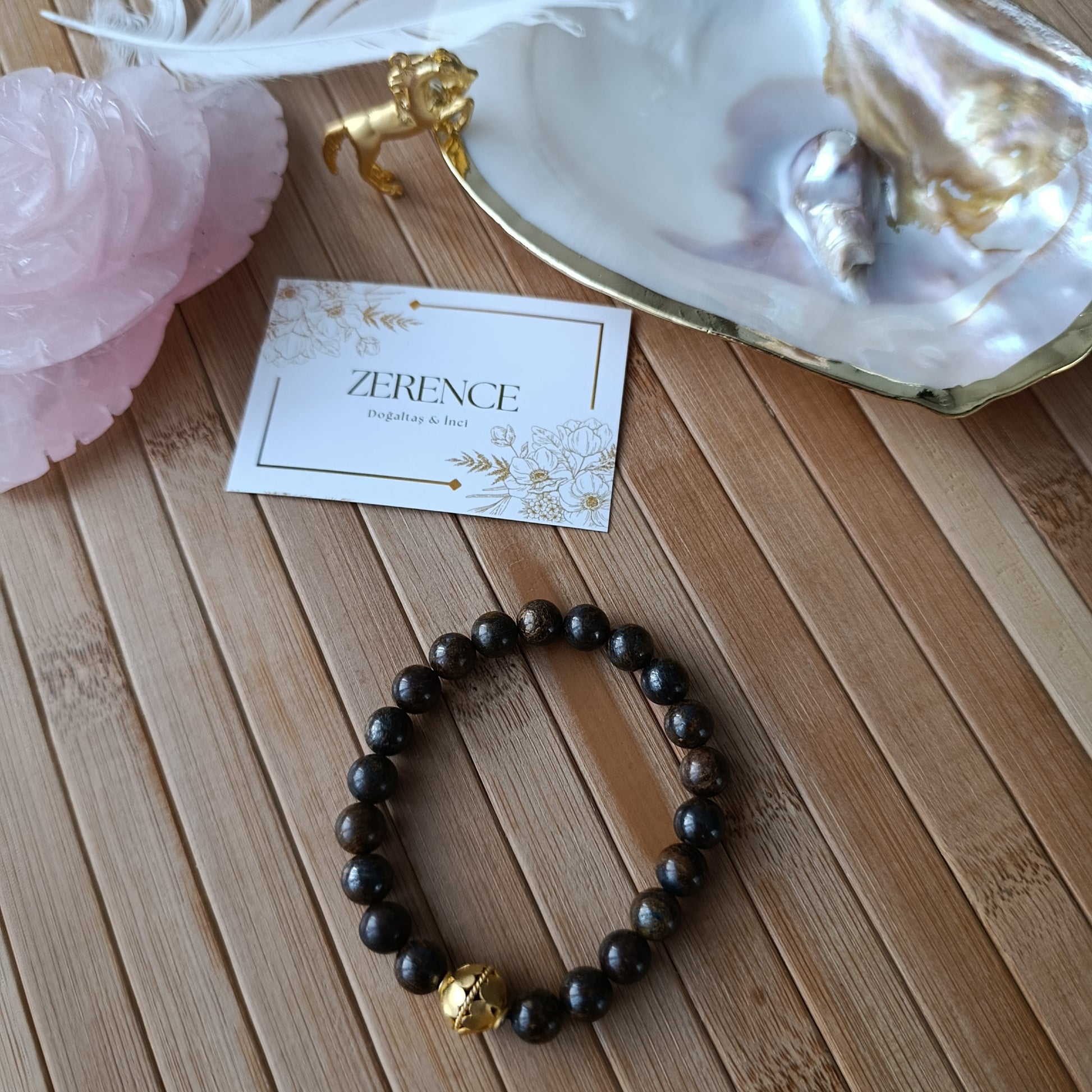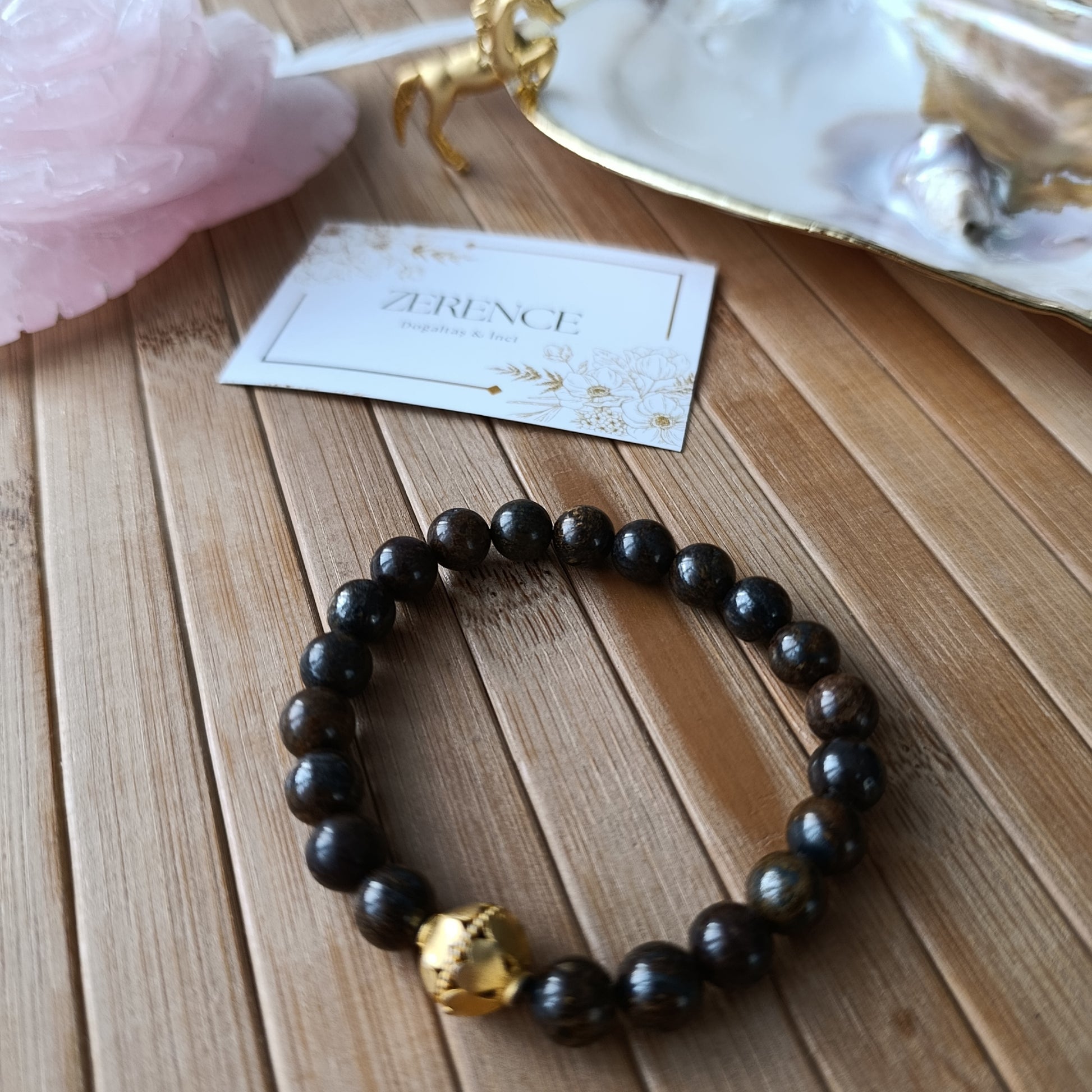 8 mm bronzit taşları ve pirinç altın kaplama malzemeler ile esnek olarak hazırlanır.