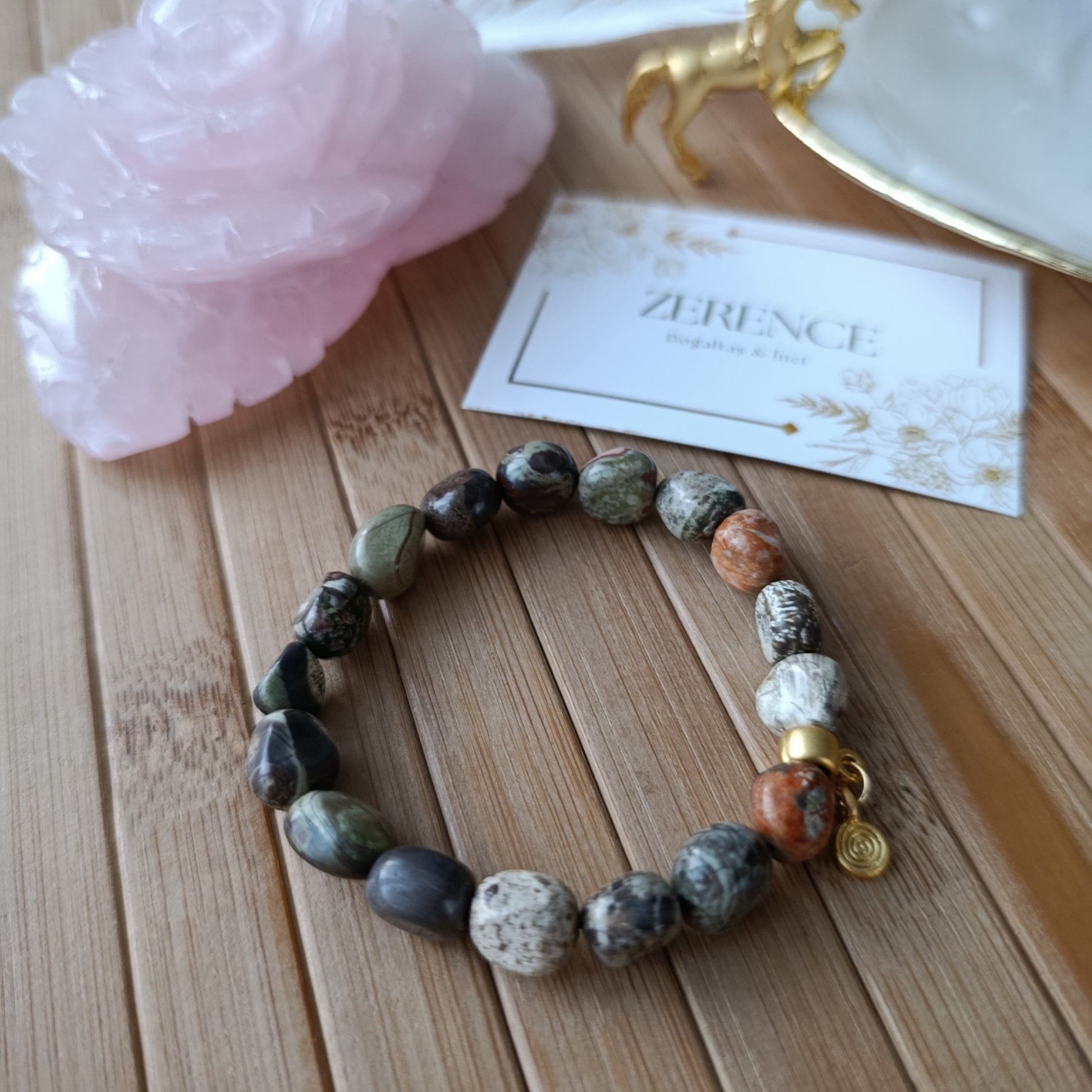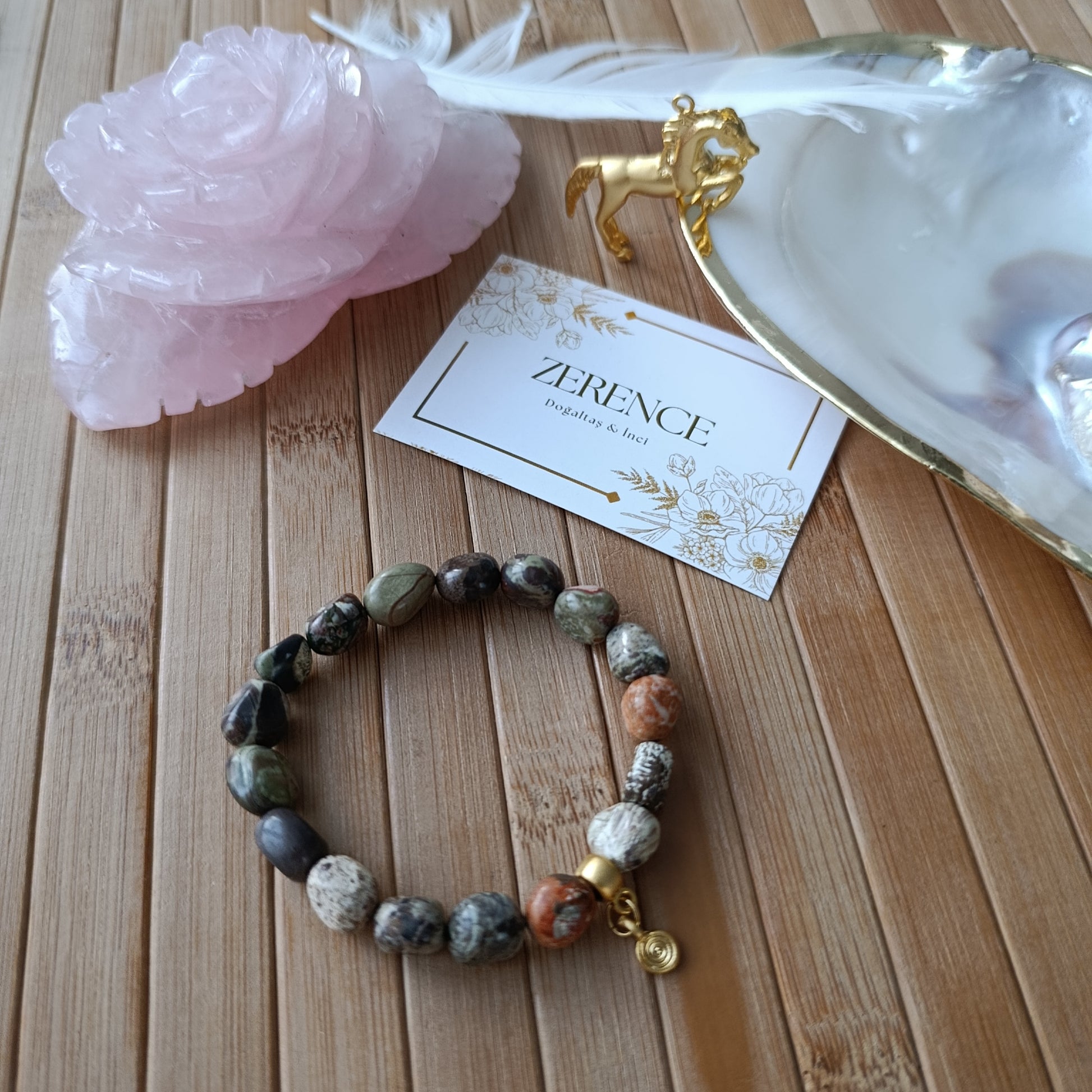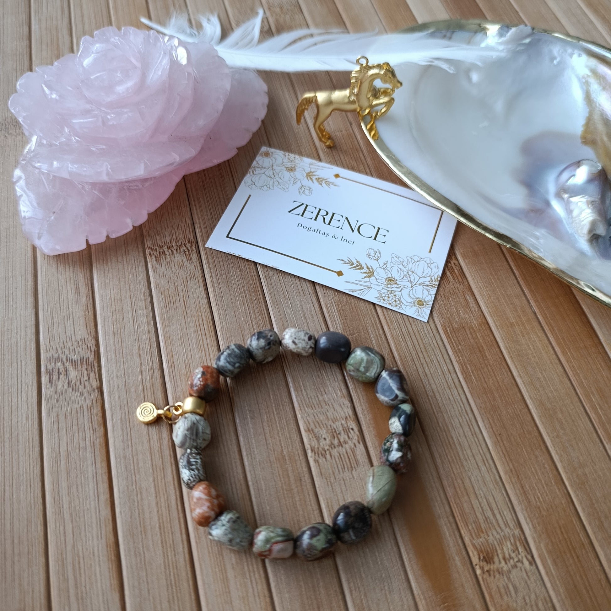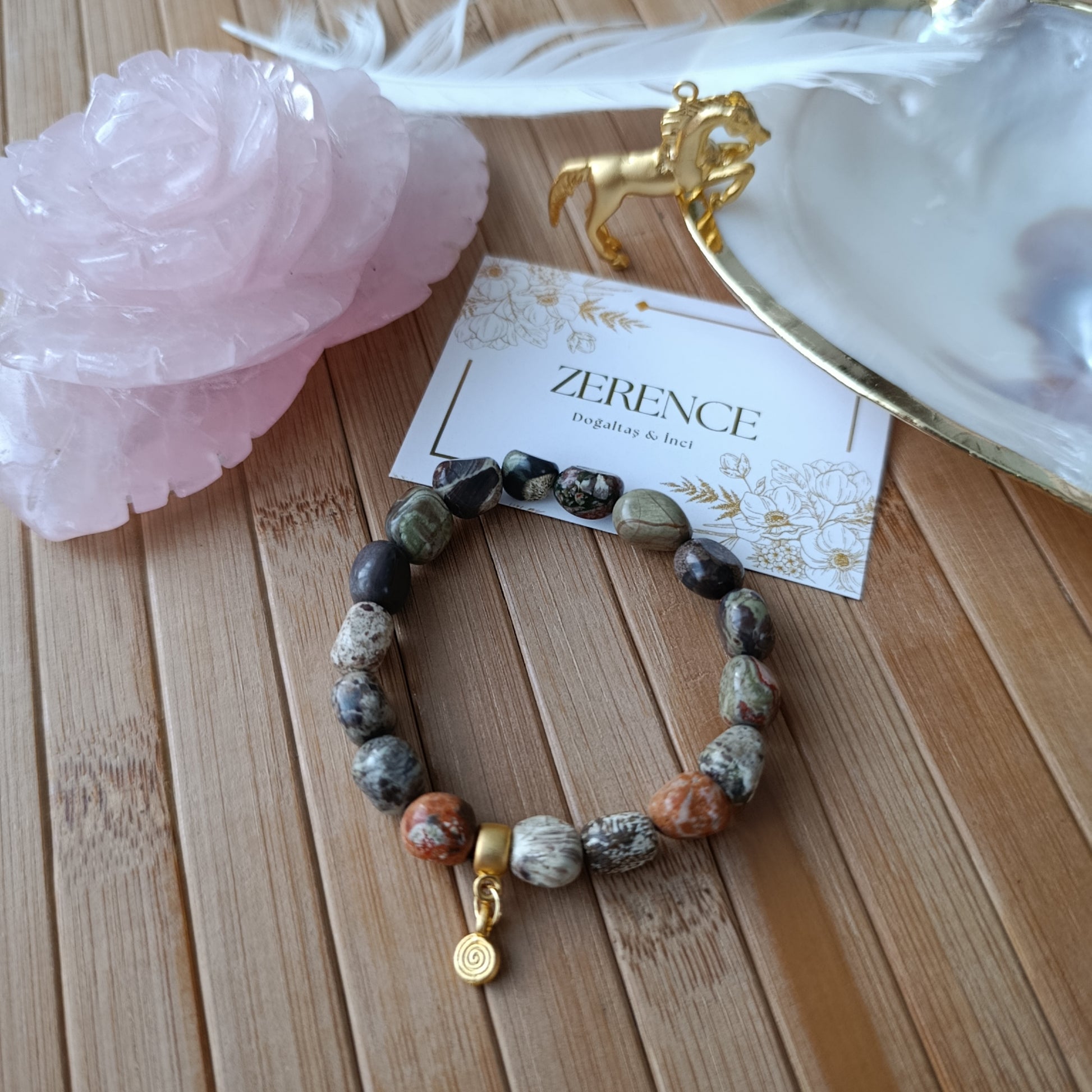 Amorf riyolit taşları ve altın kaplama pirinç detaylar ile hazırlanmıştır.