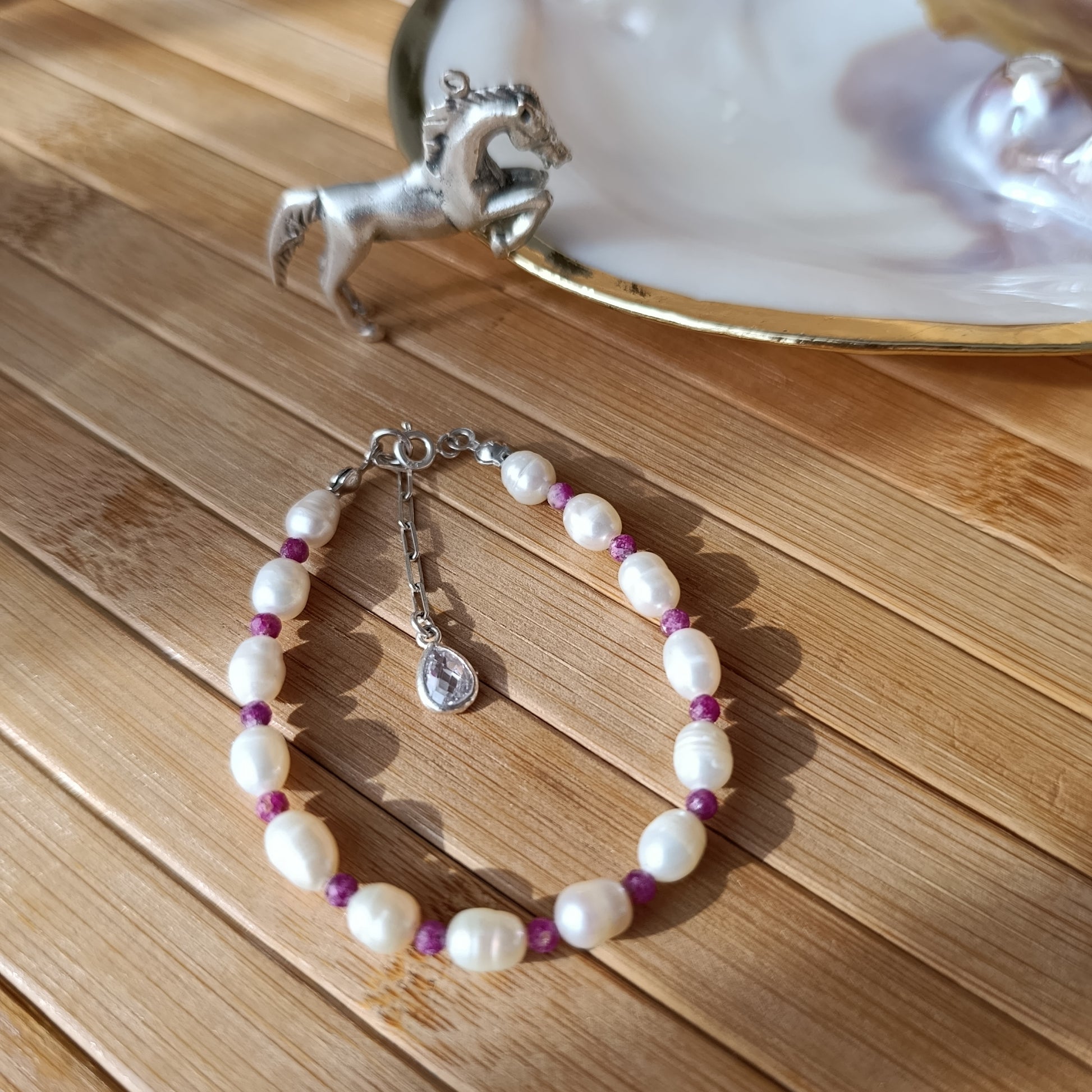 Yakut ve Arpa İnci taşları ve 925 ayar malzemeler ile hazırlanmıştır.